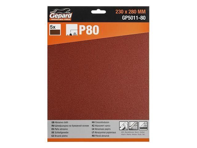 Шлифлист 230х280мм Р80 бум.осн. 5шт. GEPARD (GP5011-80) (бумага наждачная абразивная, лист шлифовальный