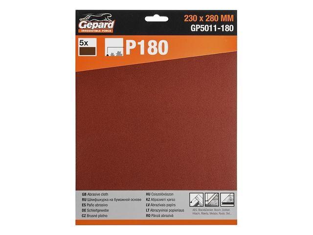 Шлифлист 230х280мм Р180 бум.осн. 5шт. GEPARD (GP5011-180) (бумага наждачная абразивная, лист шлифовальный